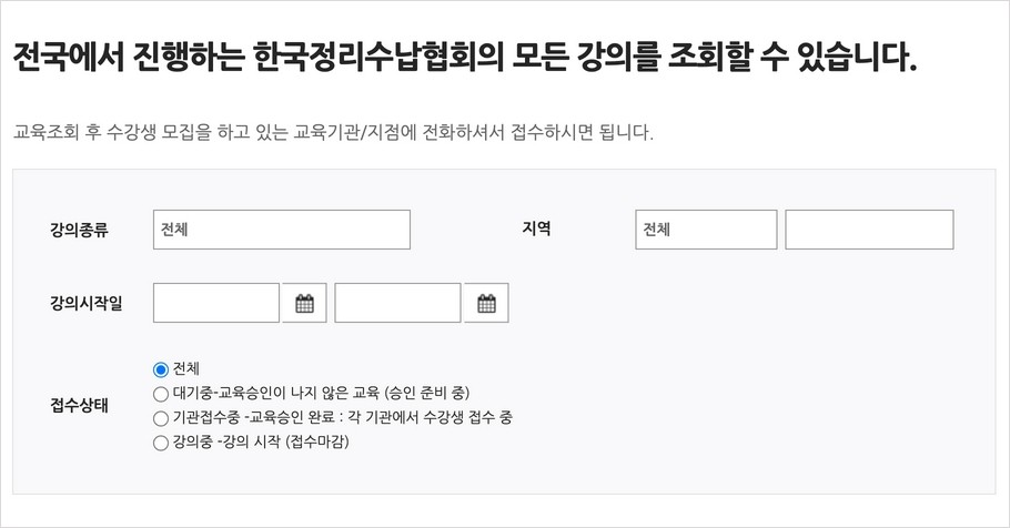 '강의종류'에서 정리수납전문가를 검색하시고, '지역'에서 사시는 곳을 선택하시면 됩니다.