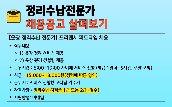 프리랜서로 정리수납전문가 일자리도 있습니다. 채용공고를 살펴보겠습니다.
