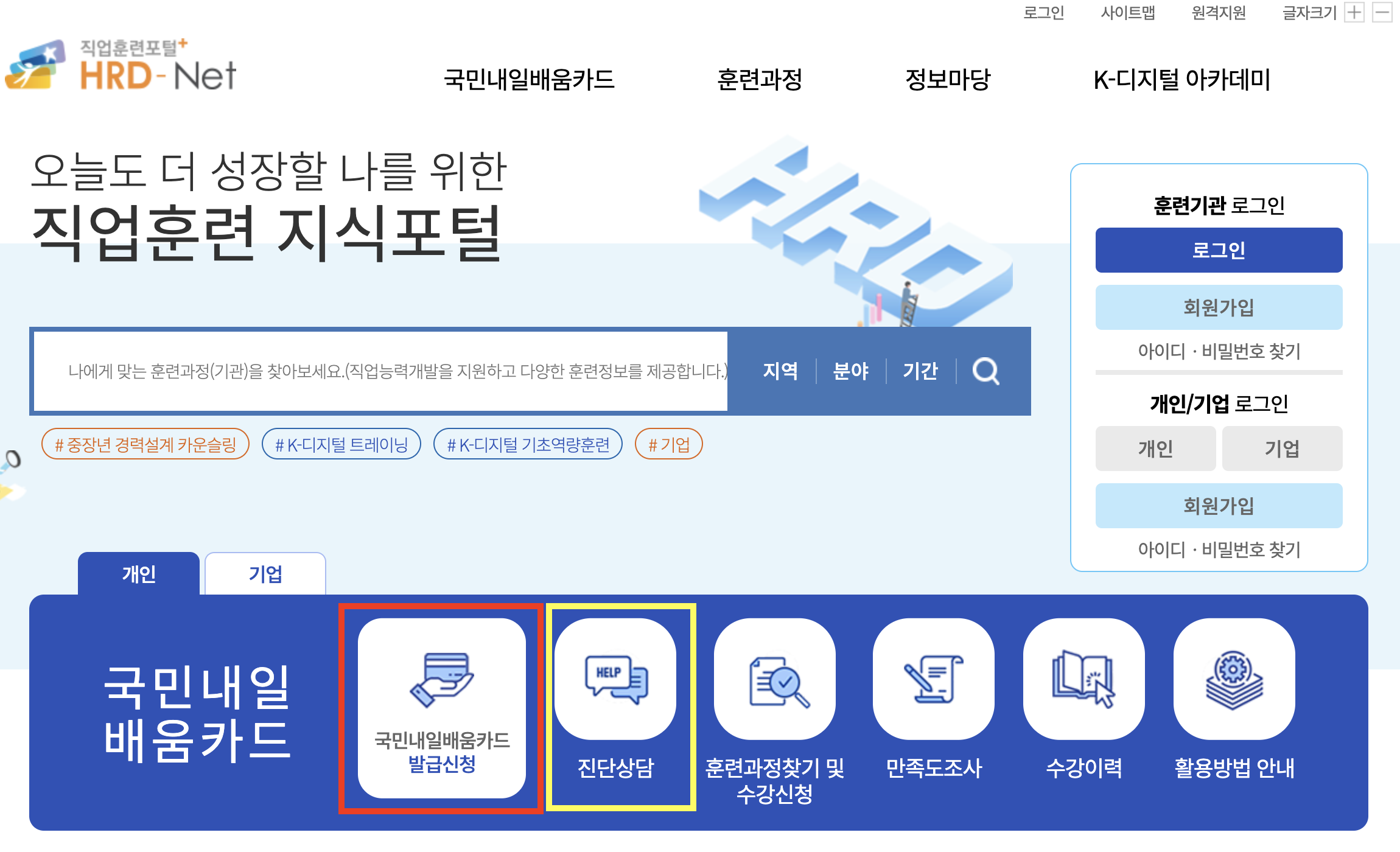 이전에는 hrd.net에서 볼 수 있었는데, 최근에는 고용 24 홈페이지에서 국비 지원 훈련을 찾으실 수 있습니다.